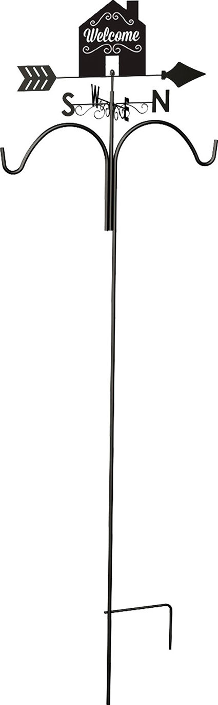 - Shows the direction of the wind and holds 2 hanging baskets in your garden