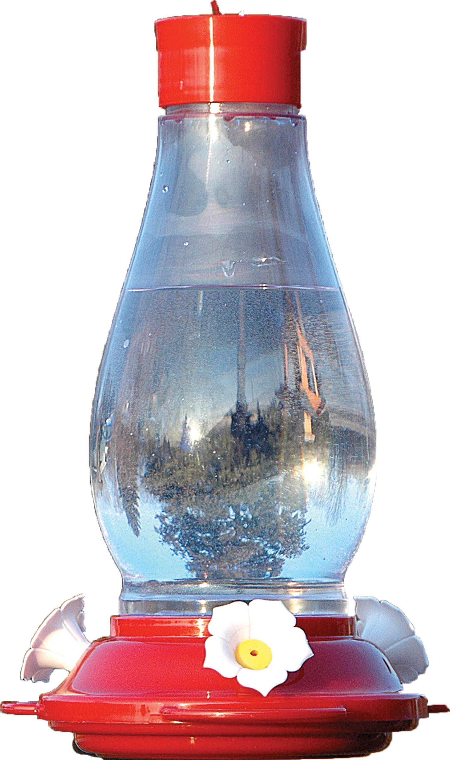 - Clear decorative plastic feeder with red top and red base that attracts a variety of hummingbirds