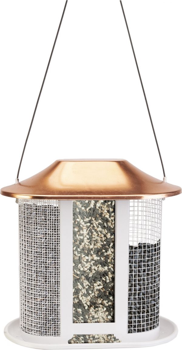 - Stylish copper finish on large slanting roof helps keep seed dry