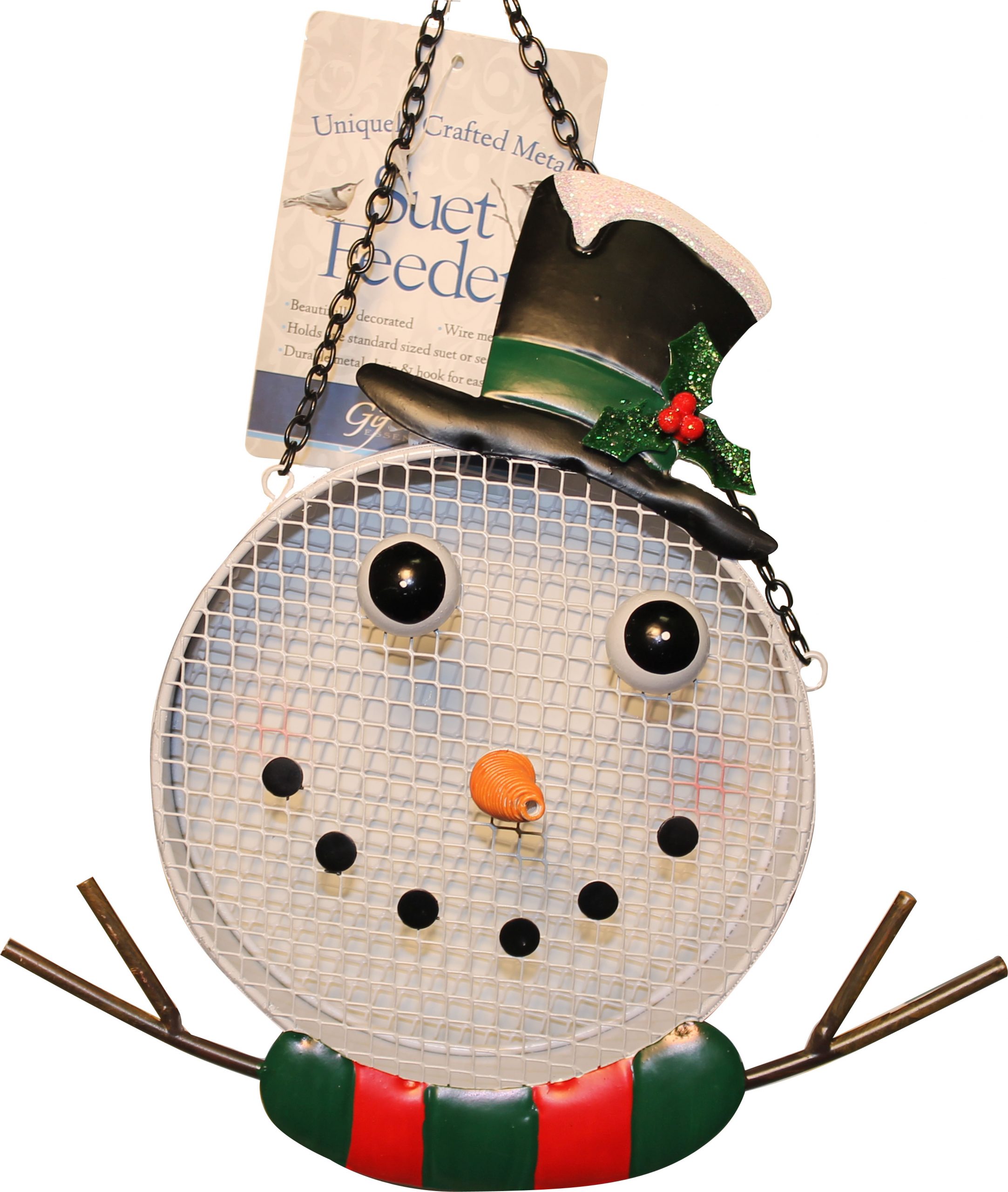 - Durable metal chain and hook for easy display.