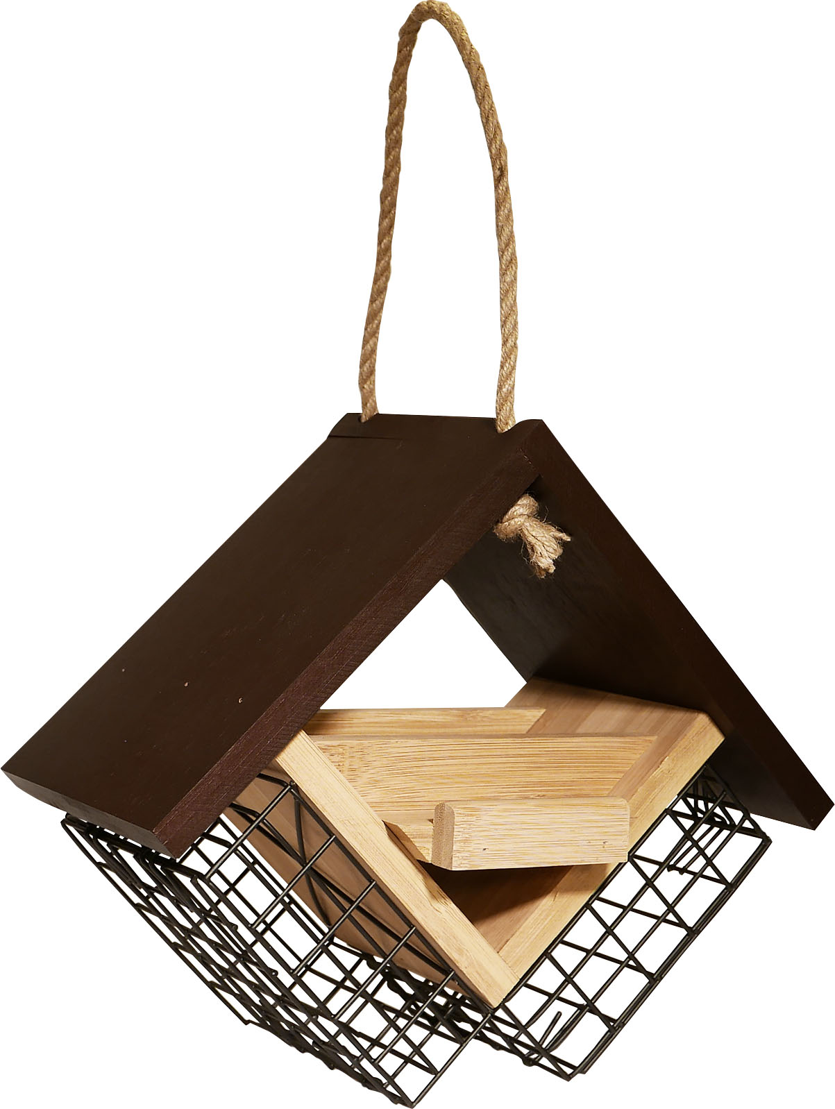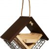 - Two wire mesh suet cages and a small hopper tray for seed with two perches.