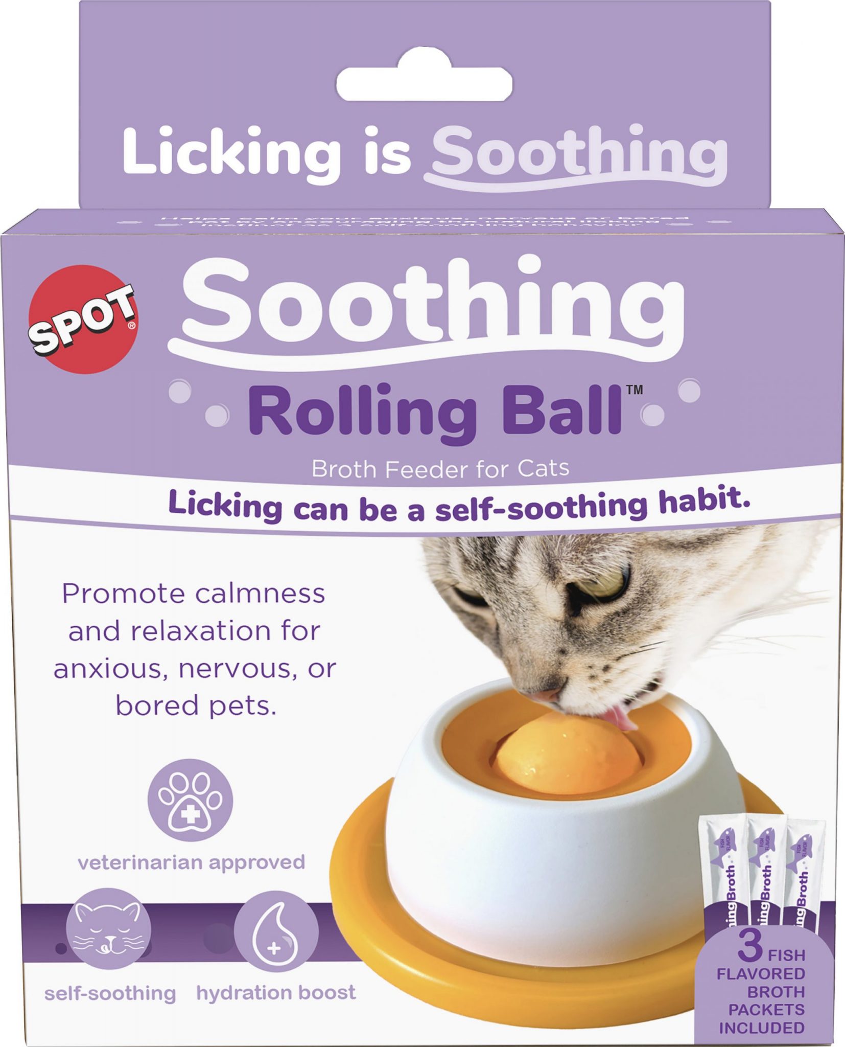 - Soothing Rolling Ball Broth Feeder for Cats promotes calmness and relaxation for anxious nervous or bored pets