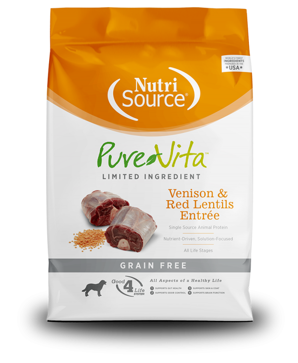 - As a member of our grain free series of dog foods, NutriSource® Pure Vita™ Venison & Red Lentils Entrée is formulated to meet AAFCO guidelines for all life stages.