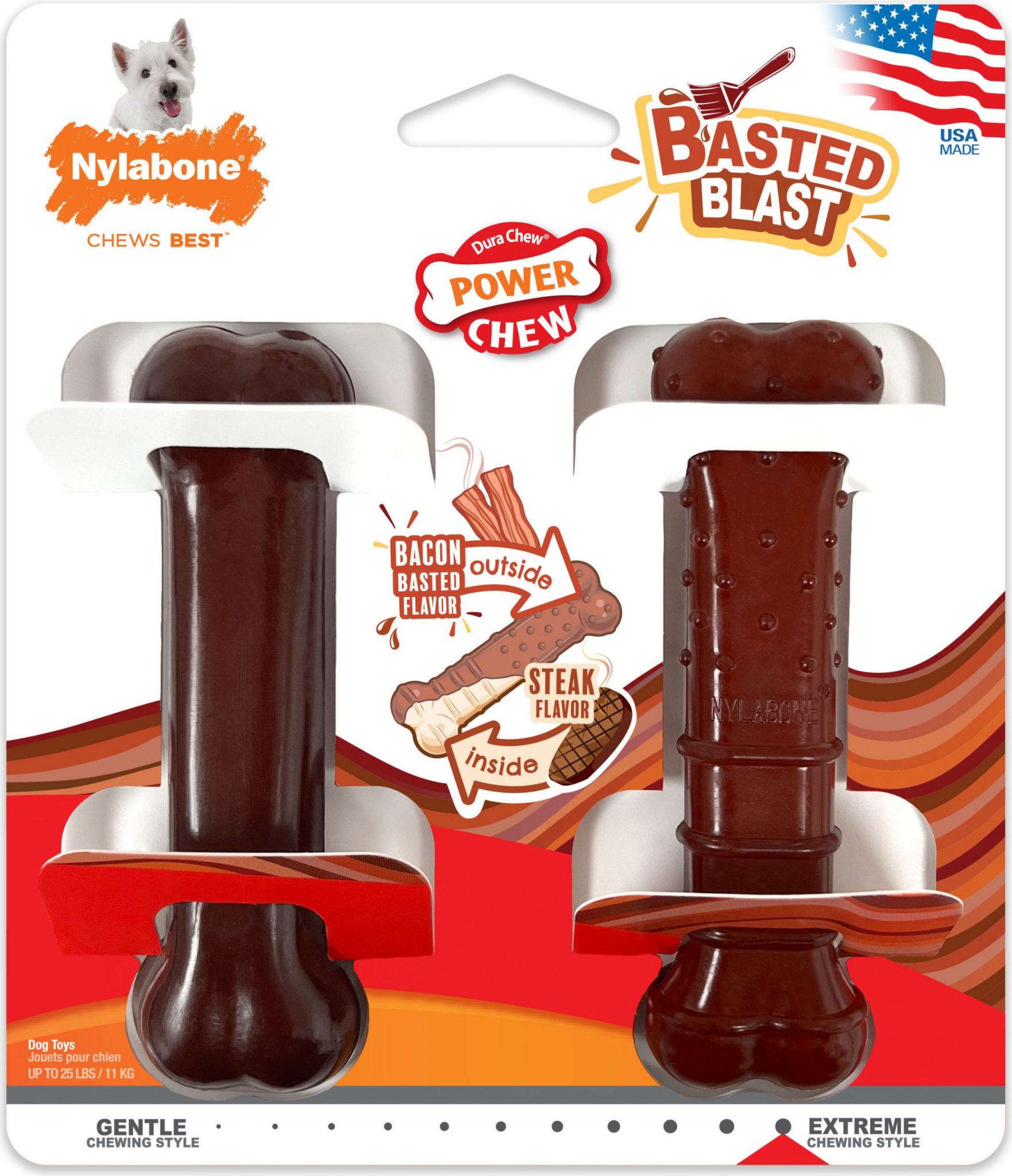 - Dual flavored dog chew toys feature our mess-free bacon-flavored basting on the outside and steak flavor on the inside