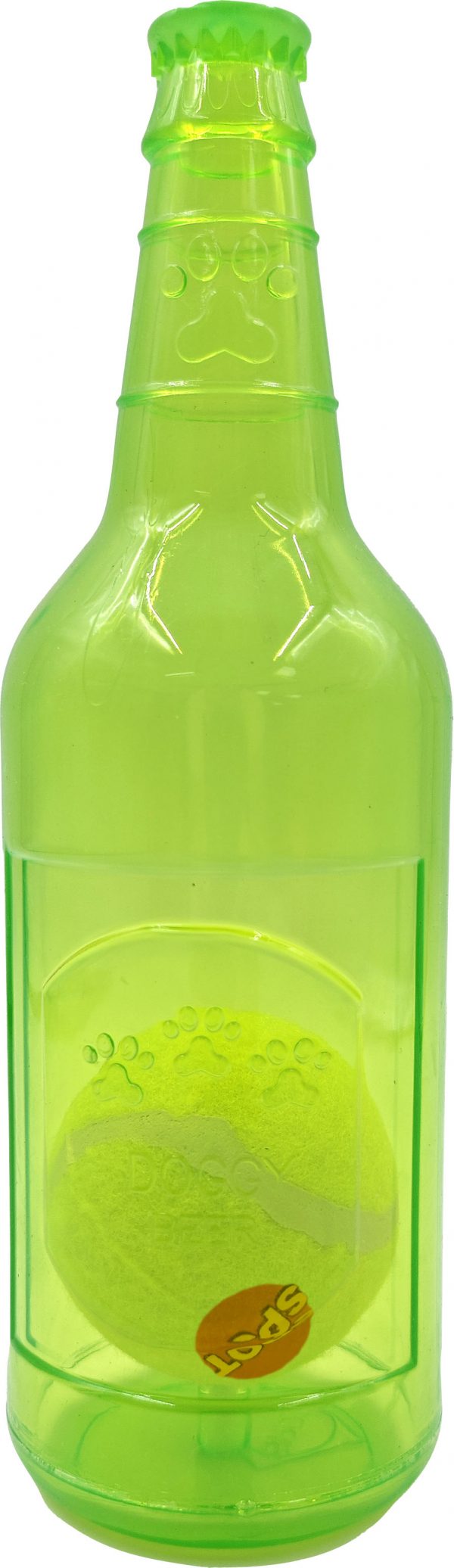 - A squeaky bottle crafted from tough chewy rubber with a surprise bouncy tennis ball inside