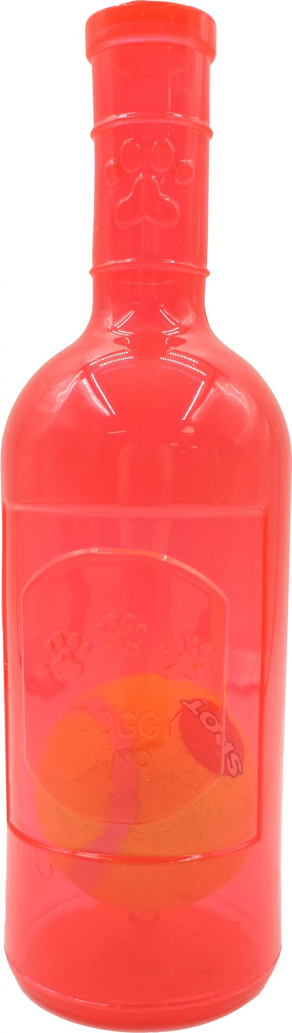 - A squeaky bottle crafted from tough chewy rubber with a surprise bouncy tennis ball inside
