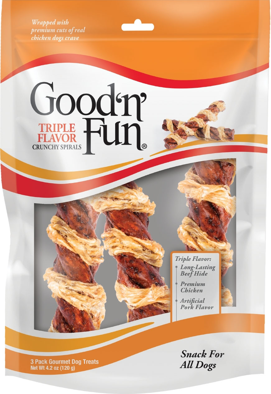 - These crunchy spirals contain a savory combination of three flavors dogs love