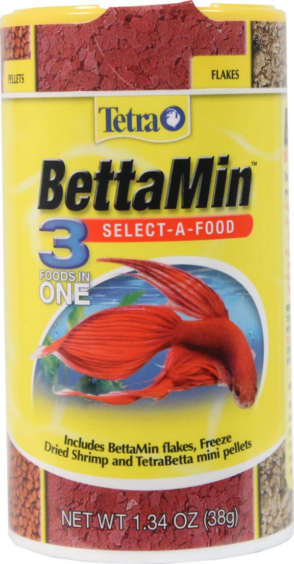 - Multi-section canister containing bettamin tropical flakes brine shrimp bits and tetrabetta mini pellets